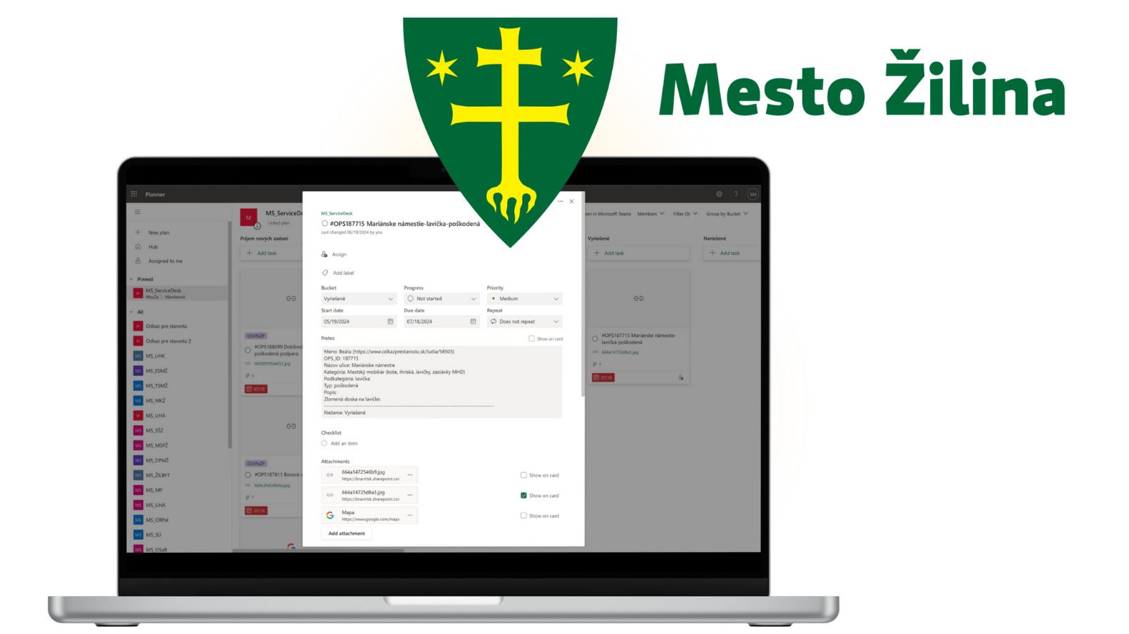 For the City of Žilina, we developed a service desk solution using Microsoft PowerApps (Power Automate). The entire system was intentionally built with Microsoft products, as city employees were already using them and had existing accounts. This provided employees with a simple solution integrated into their established systems, ensuring a more efficient process for handling submissions. Today, all complaints submitted through the form are analyzed for possible duplication before being displayed to city staff.
